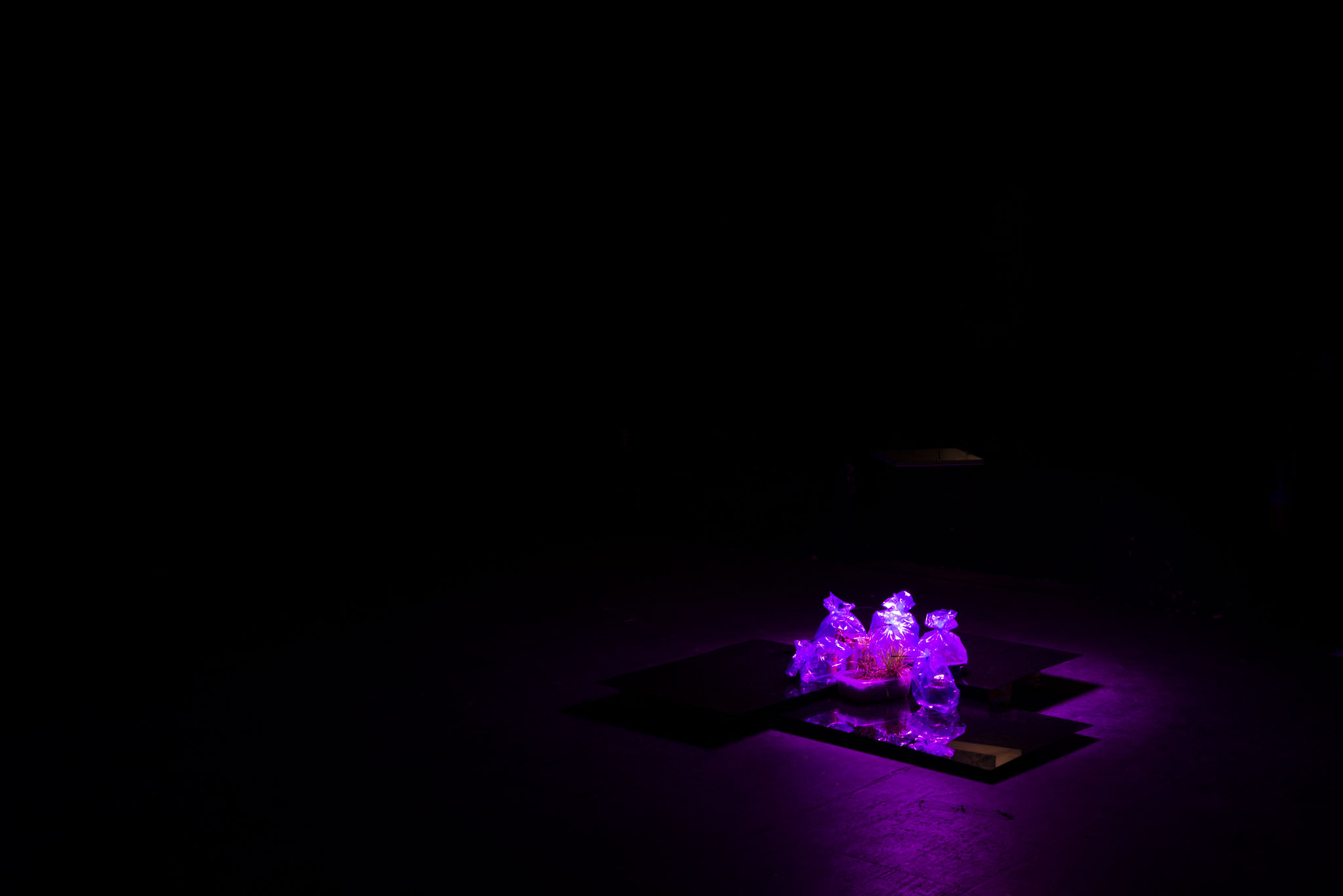 Plants cloned from the Doulton Fountain, digital inkjet prints, painted glass, found vessels, Tesco freezer bags, zip ties, gro-lite, surveillance system.